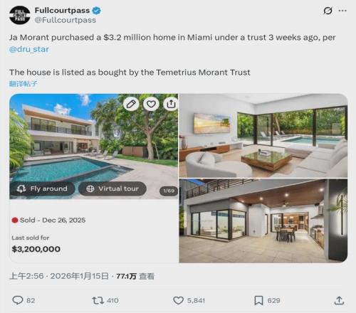 现在的莫兰特,完全换不来这些筹码。再者说,热火也不是魔术,很难有球队能在莱利身上占到便宜。上个月莫兰特花费320万美元,在迈阿密购置了一处房产。该住宅距离热火主场体育馆只有四英里左右,驾车前往仅需20多分钟。