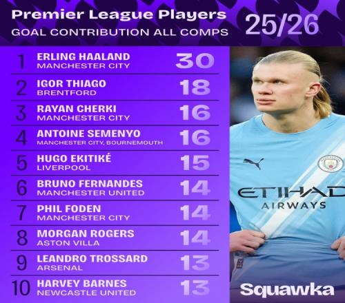 本赛季英超球员参与进球榜:哈兰德30球居首,伊戈尔18球次席